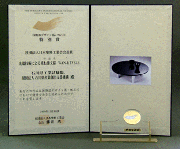 工業試験場と輪島漆器商工業協同組合が共同で開発した多用椀が,11月11日〜14日に開催された国際漆デザイン展 '99石川の漆コンペで応募作品177点の中から,特別賞(社)日本塗料工業会会長賞を受賞しました。この多用椀で用いた漆の中にカーボンブラックを加えた熱水変色防止技術やCGによる形状デザインと加飾技術が評価されました。
