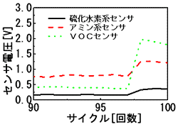 | 2.2.3 試験結果 評価試験を行なった測定結果例の一部を図3に示す。2.1.2で述べた各サイクルごとのにおいセンサ信号ピーク値を結んで応答特性を示している。縦軸はセンサ電圧(V),横軸はサイクル(回数)である。排便が確認された図3では,アミン系センサよりVOCセンサの応答変化が大きい。尿が確認された場合はこの逆の特性が得られており,3種類のにおいセンサによって排便を検知できることが分かった。 |