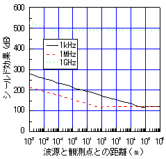 | 図2 シールド効果の周波数特性 | 図3 波源と観測点位置によるシールド効果 |