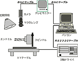| (2) | (1)で検出したエンドミル位置とあらかじめ定めた所定の位置とのずれを計算し,ずれ量に応じてエンドミルを移動させる。 |