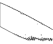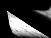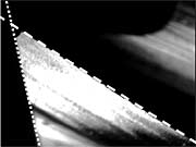 | e) | 欠けの大きさの検出 c)の曲線とd)の直線で囲まれた領域内で,刃がない部分の画素数を調べる。これは欠けの大きさに相当し,この部分が大きい物は不良品である。 |