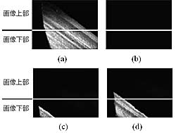 | (2) | 2値化画像を図9のように2分割し(それぞれ画像上部,画像下部とよぶ),それぞれの領域における白の画素数をカウントする。そして,この画素数に応じて次の4通りに場合分けし,エンドミルを回転させる。