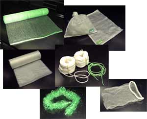 (左上から植生ネット、土のう袋、フラットヤーン織物、ロープ、人工産卵藻、ネット )