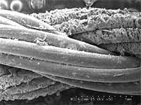 試作した各種生分解性繊維については、これまでに計4回のテストを石川県内(石川県水産総合センター海面筏、石川県農業総合研究センター実験圃場)の他、共同研究企業の協力によって、長崎県、千葉県、茨城県、神奈川県など日本各地で実施し、それぞれの分解挙動を把握してきた。さらに実用段階での生分解挙動を明確にするため、生分解性繊維で網を試作し、水深約1m、5m、海底(17m)の3段階に設置して、その経時変化を観察した。その結果、S3製の網については、水深1mで設置後約4カ月、水深5mで約11カ月後、海底で約17カ月後に破網しはじめ、破網部分が徐々に拡大していくことを確認した。単純に比較することはできないが、水深が深いほど分解が遅いことが推定される。図3に二種類の糸で作製した網の走査電子顕微鏡写真を示す。網としての外観上は変化が現れないが、拡大してみると明らかに片方だけが分解しており、混合紡糸の糸と同様、分解速度の異なる糸を組み合せることで新たな用途展開の可能性が考えられる。この他、繊維状での分解挙動をさらに確認するため、フィルムを試作して農地や住宅地で土壌埋設実験を行っている。