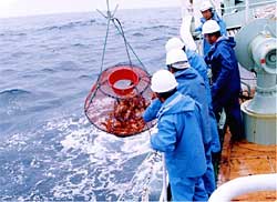 深海にかごを設置してかにを捕獲するかにかご漁では、操業中にかごが海底にひっかかってやむなく放棄する場合があり、放置されたかごが半永久的にかにを捕獲して漁場の荒廃を招くことが危惧されている。水産庁水産工学研究所が、当場試作の微生物産生タイプの生分解性繊維でベニズワイガニの試験操業を行い、従来のポリエチレン繊維製のかごと比較しても漁獲量には大差なく、また、深海に放置した場合も分解が進むことを確認した。この実験に続き、化学合成タイプの糸でかにかごを試作し、石川県水産総合センターでズワイガニを対象に試験操業した。石川県沖大和堆での2回の実験で、化学合成タイプの生分解性繊維もポリエチレン繊維製のかごと漁獲性能に差はないことを確認した。