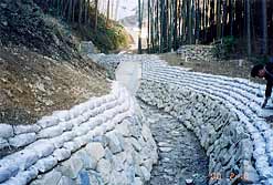 土のう袋がこれまでに採用された代表的な例として、K県の河川法面の緑化用途(種を入れた袋を縫い合わせた植生土のう)と、M県の水辺公園の岸辺浸食防止用途があり、今後の拡大が期待される。