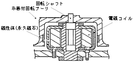 | 2.2 張力テンサ 図3に開発した張力テンサの内部構造を示す。開発に際して張力センサ同様、小型化と低コスト化を考慮した。動作原理はロータ内側面の磁性体と電磁石間の吸引力を用いて、ロータ回転トルクを変更している。糸導入ガイドを通過後の糸はロータに螺旋状に巻き付けられ糸送出ガイドを通過する際、ロータ回転トルクを変えることで糸張力を調節する。この張力テンサの最大作用張力は、糸速度200m/minで70 gfである。 |