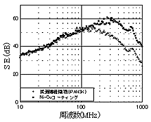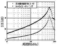 炭素繊維織物では図3及び4に示すように、電界波で40〜60dB、磁界波で10〜40dBのシールド性能を示した。これに、Ni-Cuコーイテングを行い、シールド性能を比較した。図3に見られるように、電界波では 100MHz以上の高周波領域でその向上が見られ、磁界波でも周波数全般に10dB以上の向上が見られた(図4)。今後、更に素材の改良を進めていく予定である。