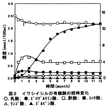 イワシイシルの生成過程における有機酸の経時変化を図2に示す。この結果から明らかなように、イワシイシル中の有機酸の大部分を占める乳酸は初期段階から相当量存在し、経時的な変化はなくほぼ一定の値を示した。また、ピログルタミン酸は経時的に増加していく傾向がみられた。酢酸、コハク酸、リンゴ酸、ピルビン酸は量的に少なく、初期段階からほぼ一定の値を示した。乳酸量がほぼ一定であったことから、原料のイワシの魚肉組織中に蓄積されていた乳酸がイワシイシル中に移行したものと考えられ、イワシイシルの生成過程において、乳酸菌の作用をほとんど受けていないものと推定される。なお、試醸したイワシイシルと市販イワシイシルとの有機酸組成の比較を行ったところ、いずれもほぼ同様の有機酸パターンを示した。