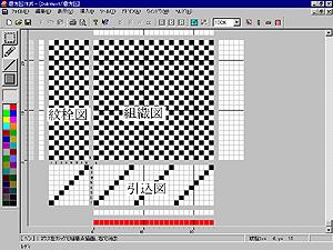 近年のパソコンの進歩はめざましいものがあり,安価で性能の良いパソコンが中小企業においても導入されている。そこで,最近のパソコンのオペレーティングシステムであるウィンドウズで使用可能なドビー織物用の織方図作成ソフトウェアの開発を行った。開発した織方図作成ソフトの基本仕様を以下に示す。また、図1は織方図作成ソフトの画面を示す。