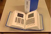 また,綜絖枠12枚使いの織物組織269点を製織し,織方図作成ソフトで作成した織方図を添付し,織物組織サンプル帳としてまとめた。織物サンプルの織り密度はたて74本/cm,よこ32本/cmである。また,たて糸にポリエステル55.5dtexの白色,よこ糸にポリエステル加工糸166.6dtexの黒色を用いて,たて糸3本を同時に上下させることにより,たて糸とよこ糸の太さをほぼ等しくし,組織を良く理解できるようにした。図3は,作成したサンプル帳である。269点は2冊に分冊されている。 また,織方図作成ソフトで確認できる組織図のデータをフロッピーディスクで添付した。