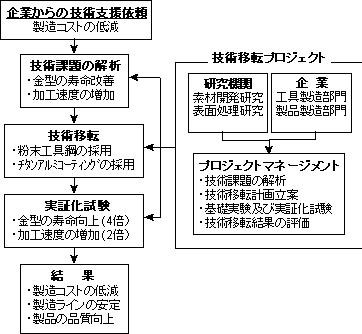 技術移転によって提供される新技術は,技術課題の解析によって明らかにされた問題を効率よく解決できなければならない。図1は,金型の長寿命化と加工速度増加を図るため,粉末工具鋼技術とチタンアルミコーティング処理技術に関する研究成果の移転を示す。 このように,技術移転を踏まえた研究開発を行うときに重要なのは,技術仕様の単なる高度化ではなく,企業にどのように役に立つか,また,企業が抱える課題を解決できるかどうかである。このように,企業側に立脚した視点で研究開発や技術移転が進められることが重要である。