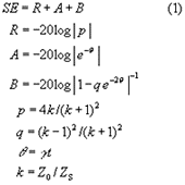 ここで,Rはシールド表面における反射損失,Aはシールド材内での減衰損失,Bはシールド材内の多重反射項である。また,γはシールド材内部の伝搬定数(rad/m),tはシールド材厚さ(m),Z0は電磁界の波動インピーダンス(Ω),ZSはシールド材の特性インピーダンス(Ω)である。 |