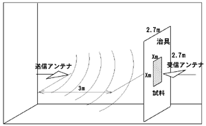 | 4.電磁シールド効果の測定 シールド効果にはダイポール波源からの近傍領域測定法と遠方領域測定法とがあり,第3章までの理論解析より,それぞれ測定結果は異なることがわかっている。ここでは,波源と観測点との距離に影響されず一定となる遠方領域のシールド効果について,簡易的に測定する手法を提案した。 4.1 遠方領域測定用治具 測定は図7に示すように,木型にアルミニウム箔を貼り付けた簡易測定用治具を設置することにより,繊維シールド材を評価した。 シールド効果は試料がある場合とない場合とにおける電界強度の比をとり求める。3章の解析結果で明らかなように,波源と観測点との距離は,波長/(2π)以上あれば遠方領域のシールド効果を求めることができる。しかし,シールド板にアンテナを近づけすぎると,実際にはアンテナのインピーダンスが変化したり,治具の開口部がスロットアンテナとなることがある。従って,今回は周波数を300MHz(波長:1m)以上の測定とし,波源(送信アンテナ)から十分離れた位置(3m)に治具を設置することとした。 次に,治具の上面,及び側面より電磁波は回折するため,数値計算によりシールド効果を測定することができるダイナミックレンジを求める必要がある。計算には治具を完全導体板と仮定することにより,表2に示す試料サイズxの違いによるレンジを求めた。ここで,シールド材有りの場合は試料を完全導体とした。 シールド試料サイズを大きくするほどダイナミックレンジは大きくとれるが,実用上の試料サイズは大きくできないため,表2の計算結果より比較的レンジが大きくとれる一辺が0.6mの試料サイズとして,図8に示す治具を製作した。 4.2 測定結果 石川県では繊維産業が発達しており,ペースメーカ等の誤動作防止策として電波遮蔽繊維の開発が行われている。そこで,表3に示す繊維試料について測定を行った。ここで,生地用の糸は芯糸に花糸を巻き付け,さらに押糸を巻き付けることによって合撚され,これを製織,あるいは編成して生地とする。 測定結果を図9に示す。比較のため,ADVANTEST社の遠方領域用シールド効果評価器(型式:TR17302)を用いての測定結果も示す。 これらの図より,本手法とADVANTEST法とでは約4dB以内で一致しており,今回提案した簡易測定用治具によるシールド効果測定法の妥当性が確認できた。 ただし,前節のダイナミックレンジの考察でも示したように,本手法は繊維シールド材のように比較的シールド効果が高くないものに適用できる。 |