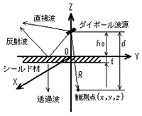 2.2.1 解析モデル ここでは,図1に示すような無限大平板のシールド材解析モデルを対象とする。座標原点よりz=h0の位置に電気ダイポール波源を設定し,波源と観測点との距離をRとする。ダイポール軸はシールド材に対して,水平(X)方向を想定する。シールド材上部では直接波と反射波があり,シールド板下部では下降波(透過波)のみが存在する。解析に際し,波源位置は固定し,観測点は任意位置に移動が可能とする。 |