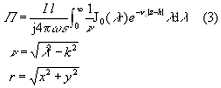 | また,水平ダイポールの場合は,層間の不均質性を反映させるため,X,Z方向のΠを考えなければならない2)。この式を円筒波の積分で表現するゾンマーフェルト(Sommerfeld)積分表示式を用いることにより式(3)で表される2)3)。 | |