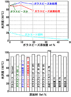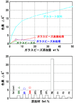 上図でゲルコート試料と人造大理石試料を比較するとゲルコート試料の方が光沢度は減少している。これは蛍光塗料を添加した場合も同様であり,人造大理石試料ではコンパウンド層が光沢度の上昇に大きく寄与していることが分かる。ガラスビーズの添加量による変化をみると,ゲルコート試料では添加量が増加するに従い減少しているが,人造大理石試料では添加量10wt%までは上昇し,それ以降は減少傾向にある。また,ガラスビーズを樹脂との接着性を上げるために表面処理すると,光沢度の上昇は少なく,20wt%も添加すると逆に低下している。これは表面処理剤がガラスビーズを覆っているために,ガラスビーズでの光の反射率が低下するものと考えられる。 添加材の種類による影響は,何れの添加材によっても光沢度は上昇するが,ガラスビーズでもガラスフレークでも粒径が小さいほど上昇している。また,蛍光塗料の添加では赤色,青色,黄色の順で上昇するが,見た目にも赤色が最も着色として目立つことから,光の吸収と関連していると考えられる。合成マイカパールを添加すると,人造大理石試料,ゲルコート試料とも光沢度は上昇し,人造大理石試料の場合は60度鏡面光沢は測定できないほど上昇している。これは,この合成パールマイカにはパール調にするために合成マイカに酸化チタンのコーティングがされており,光沢度が著しく上昇したものであり,下層のコンパウンド層の影響を受けなくなったものである。そこで,光の入射角を20度として鏡面光沢を測定したところ,合成マイカパールの光沢度は,ガラスビーズおよびガラスフレークの粒径が小さいものを添加した試料と同程度の上昇であり,その他の試料では低下した。光の入射角度が小さくなると,添加材が小さいほど光沢度は上昇するが,表面コーティングの種類による影響は減少するものと思われる。 色差の変化を図2に示す。上図に示すようにゲルコート試料ではガラスビーズの添加量に従い色差は大きく変化しているが,人造大理石にすると20wt%添加しても色差は3程度と小さく,肉眼では色の変化は目立たないものとなっている。また,表面処理があると明度L*と色度a*は少し異なるが色差はさほど変化していない。蛍光塗料を添加したゲルコート試料は,蛍光塗料の色が現れ,特に赤色が顕著であったが,光に晒した後では充分に蛍光を発した。 さらに,添加材の種類が異なっても下図に示すように合成マイカパールを添加した試料のみがそれ自身の色を出すために大きく変化するものの,それ以外は色差の変化は小さいものであり,添加剤を入れても色の変化は目に付き難いことが分かった。そのために蛍光顔料の添加による効果も少なく,表面のゲルコート層のみへの添加では蛍光性はほとんど確認できなかった。蛍光性を持たすには,ゲルコート層よりもコンパウンド層に添加する必要があると考えられる。合成マイカパールの場合は少ない添加量で色が大きく変わり,下層の素材や色の遮蔽効果が期待でき,リサイクル材の応用が検討できる。 |
