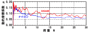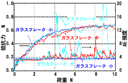 バーコル硬さと同じく圧子を押し込むマイクロビッカース硬さの結果を図4に示す。ガラスビーズの添加により,ゲルコート試料は硬さの向上が見られ,人造大理石試料では僅かながら向上し,20wt%添加ではバラツキが大きいものの平均すると硬さは向上している。また,添加材の種類ではガラスビーズは硬さは向上するものの,他の添加材では反対に低下してしまった。これは,マイクロビッカース硬さの場合にはバーコル硬さに比べて加圧する力の設定が小さく,圧子のゲルコート内部への浸入が少なくなり,極表面の樹脂層の硬さを計測したものと考えられる。しかし,樹脂そのものの硬さより低下したことについては,今後さらに検討する必要がある。なお,合成マイカパールの場合は,人造大理石試料では硬さを測定できなかった。しかし,ゲルコート試料では添加量が2wt%と少なくても,ゲルコート樹脂単体の場合の約3倍に向上した。このため人造大理石試料でも加重を大きくしたが,光沢が強すぎるためか,今回は硬さを求めることができなかった。 表面を引っ掻いて硬さを評価する鉛筆引っ掻き硬さの結果を図5に示す。ゲルコート試料,人造大理石試料ともガラスビーズの添加量によって硬さは向上するが,5wt%の添加による種類の差異は殆どなく,僅かに合成パールマイカの硬さが1ランク向上しているだけである。しかし,ゲルコート試料の場合は合成パールマイカを添加しても硬さの向上はみられなかった。これもマイクロビッカース硬さの場合と同じくゲルコートの極表面を覆っている樹脂に傷が付くためと考えられる。表面の耐擦過性を向上させるには樹脂そのものの硬さを上げる必要がある。または,表面の樹脂層を研磨して取り除き,無機材料を表面に出すことが考えられる。しかし,この場合は耐水性が低下することを考慮する必要がある。 鉛筆引っ掻き硬さと評価方法が似ているダイヤモンドチップによるスクラッチ試験を人造大理石試料で行った。その中で,最も変化が大きく現れたガラスフレークの結果を図6に示す。ガラスフレークの粒径の増大に従い抵抗力の振幅は大きくなり,AEの強度も大きくなっている。各種添加材を入れた人造大理石試料はいずれも負荷加重に対する抵抗力の変化の傾向は全体を通じてこのガラスフレークとほぼ等しく,粒径が小さいために抵抗力やAE強度はより変化の少ないものとなった。これは,いずれの試料においても,ほぼ同じ負荷加重でコンパウンド層までダイヤモンドチップが達してためであり,負荷加重の変化が大き過ぎたためではないかと考えられる。 上述のスクラッチ試験のダイヤモンドチップを直径6mmの鋼球(SUS440C)とナイロン球に換えて摩擦試験を行った。ガラスフレークの粒径の大きい添加材を入れた人造大理石試料の結果を図7に示す。鋼球,ナイロン球とも初期の動的摩擦係数の振幅は大きいものの,加重が増加するに連れて摩擦係数は小さくなる傾向にあるが,鋼球はナイロン球に比べて動的摩擦係数の変化が大きく,その平均値も大きくなっている。この傾向はいずれの人造大理石試料においても同様であった。今回は2種類の球で試験を行ったが,球の種類を増やせば製品評価に必要な表面性状の評価が可能になる。 |