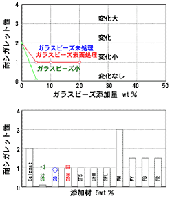 添加材の種類ではガラスビーズ,ガラスフレークおよび蛍光塗料は無添加よりも改善されるものの変化はあり,蛍光塗料による改善度合いはガラスよりも小さい。合成マイカパールでは着色が無添加よりも目立ている。これは合成マイカパールの光沢が大きく,より樹脂の着色が目立つものと思われる。 |