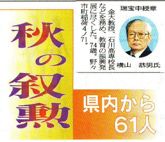 横山先生 瑞宝中綬賞 叙勲